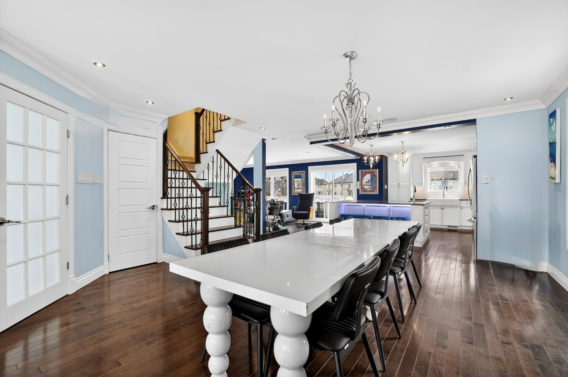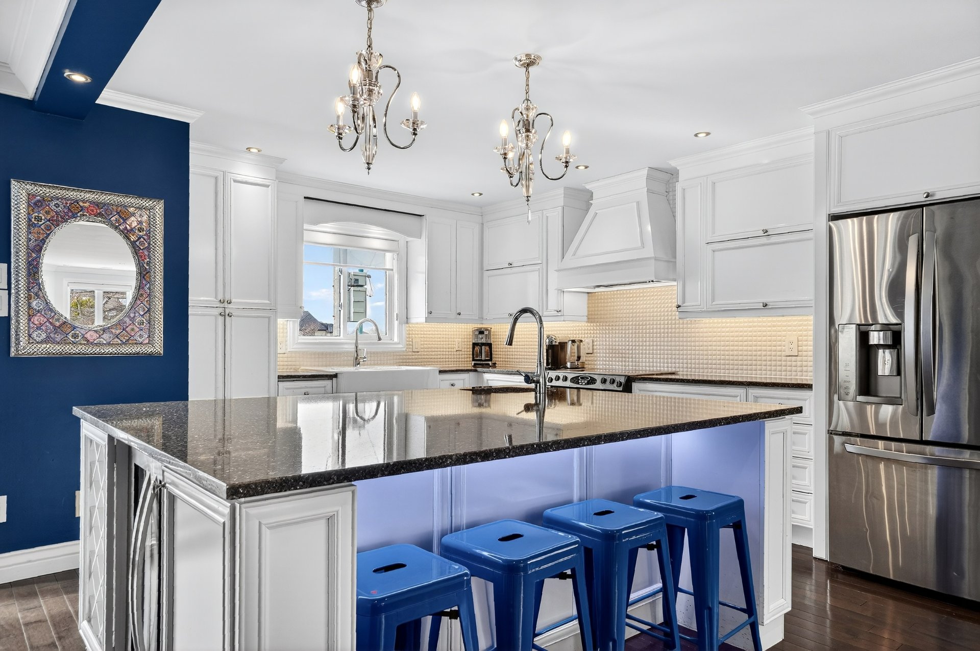 La cuisine propose un imposant îlot en granite, une abondance de rangement, un éclairage DEL intégré ainsi qu'un système de son/interphone, idéale autant pour recevoir que pour le quotidien. Chaque espace a été pensé pour offrir confort, fluidité et fonctionnalité.