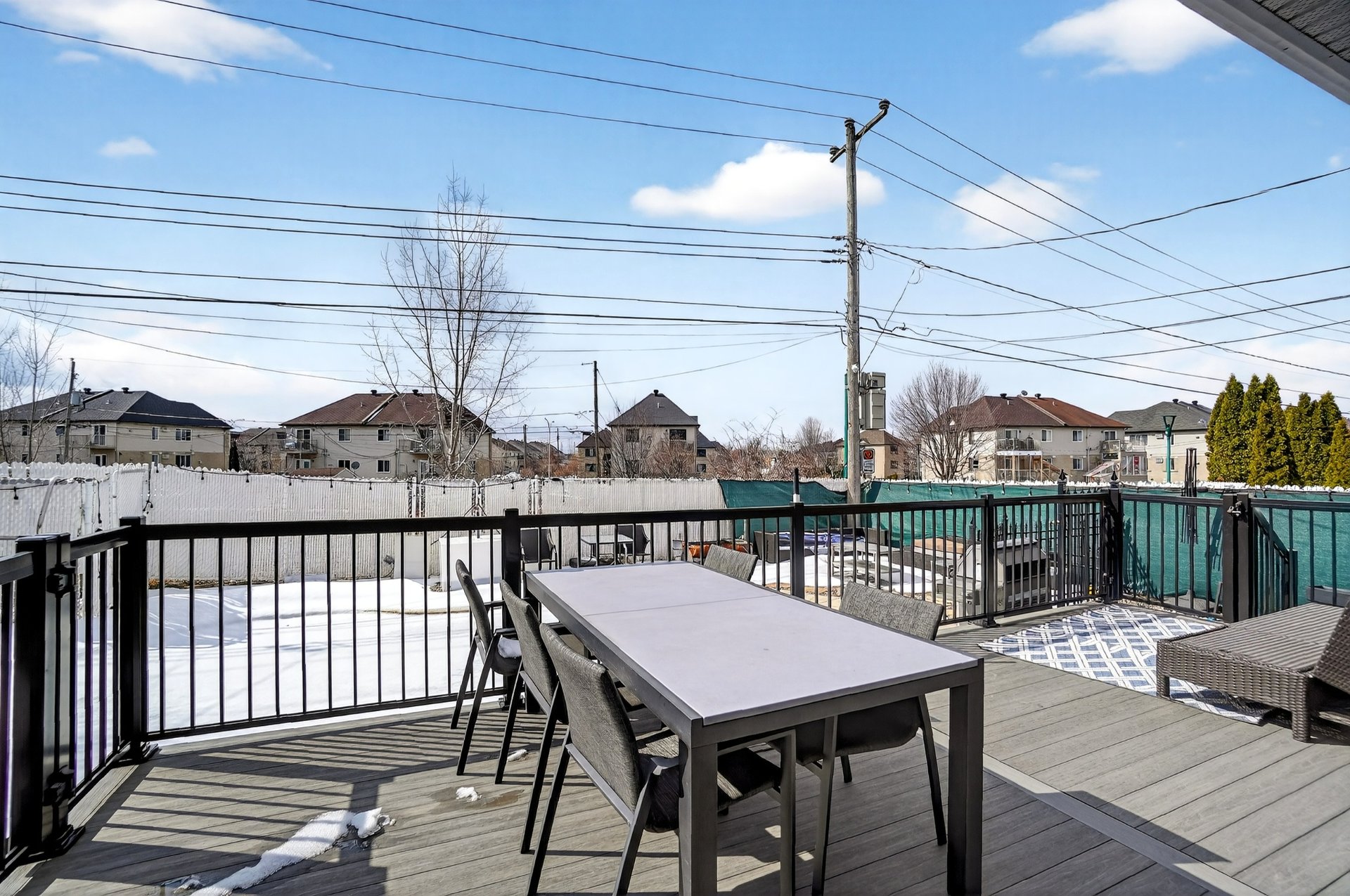 À l'extérieur, la cour arrière intime orientée plein ouest constitue un véritable espace de vie. La terrasse neuve en composite, la piscine avec nouvelle toile et l'aménagement paysager créent un environnement idéal pour se détendre ou recevoir en toute tranquillité.