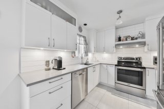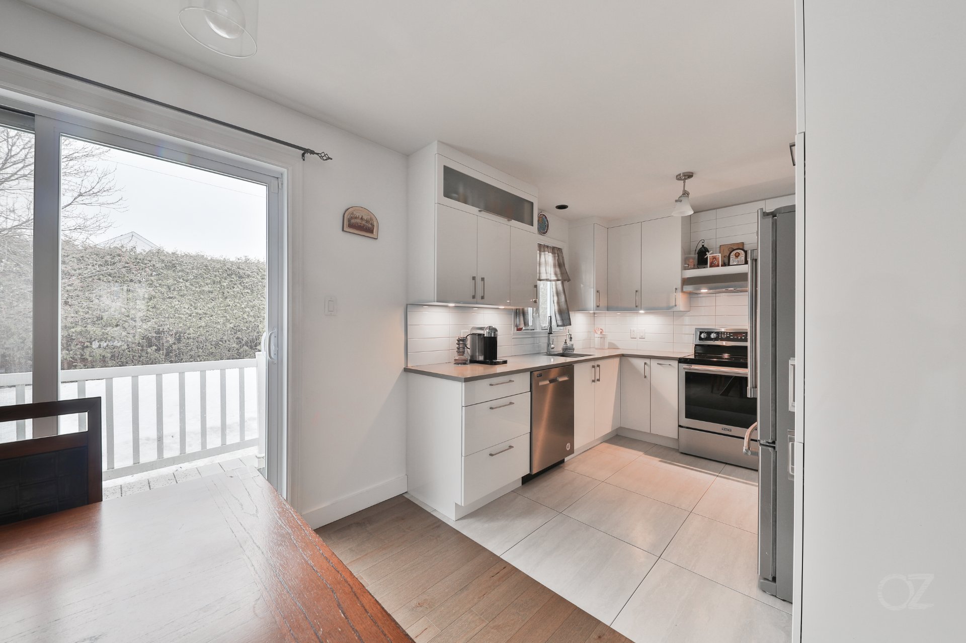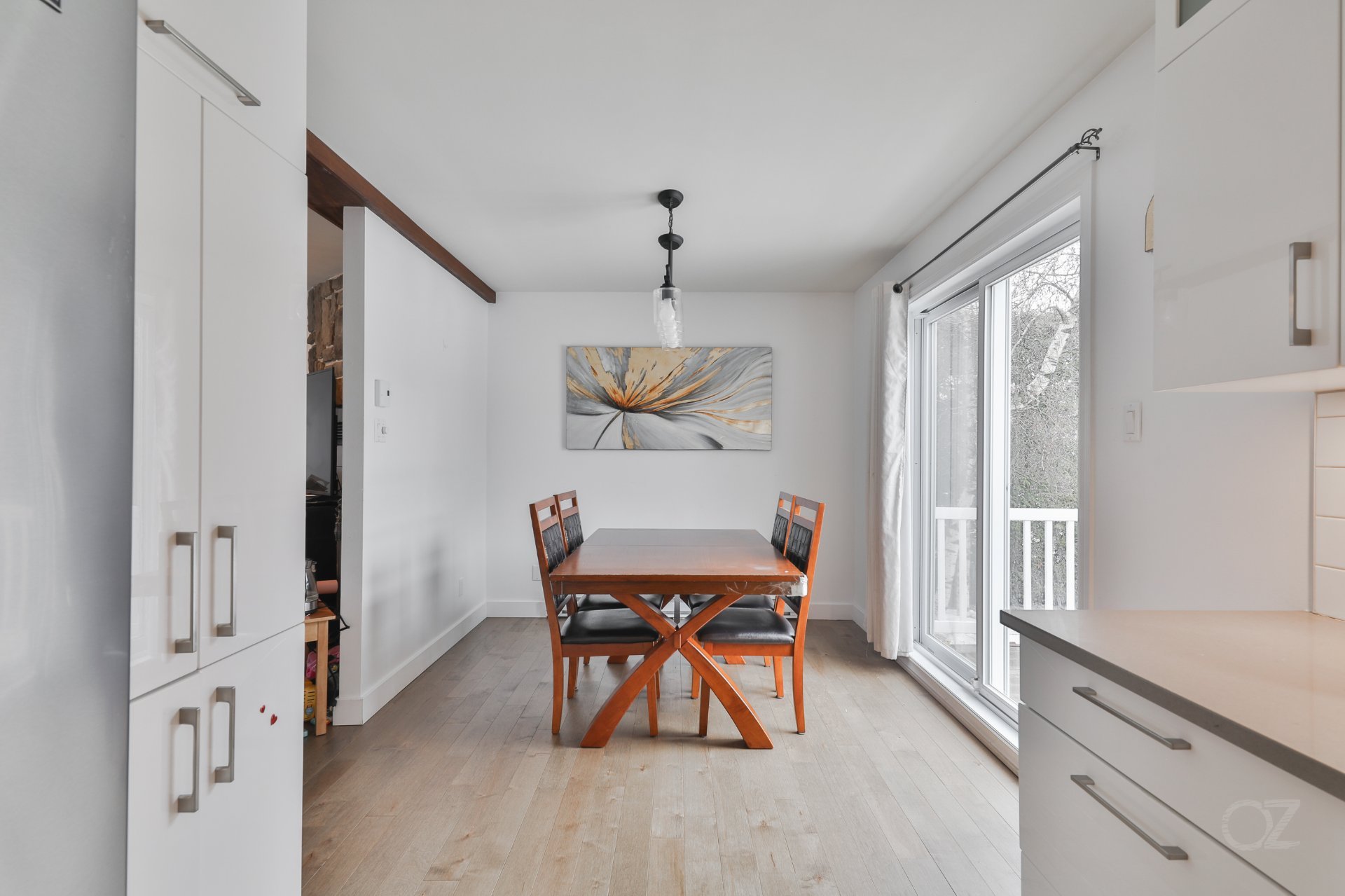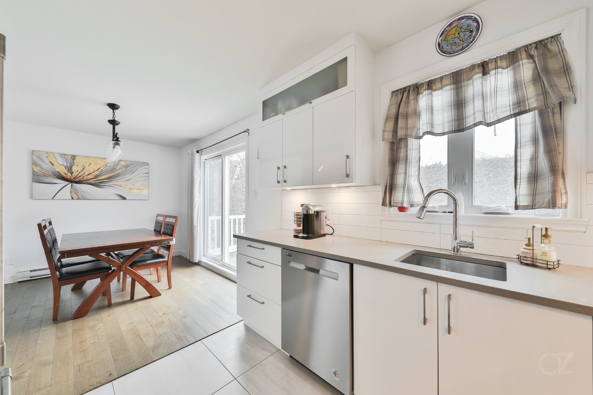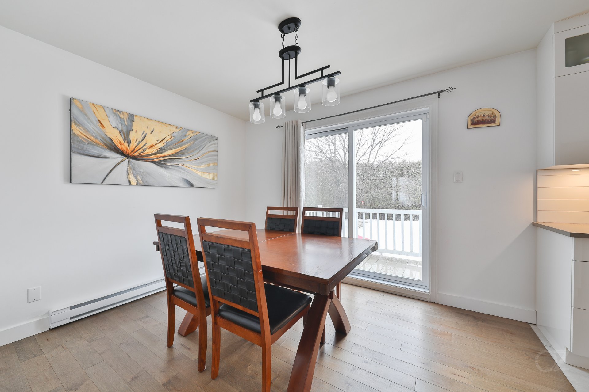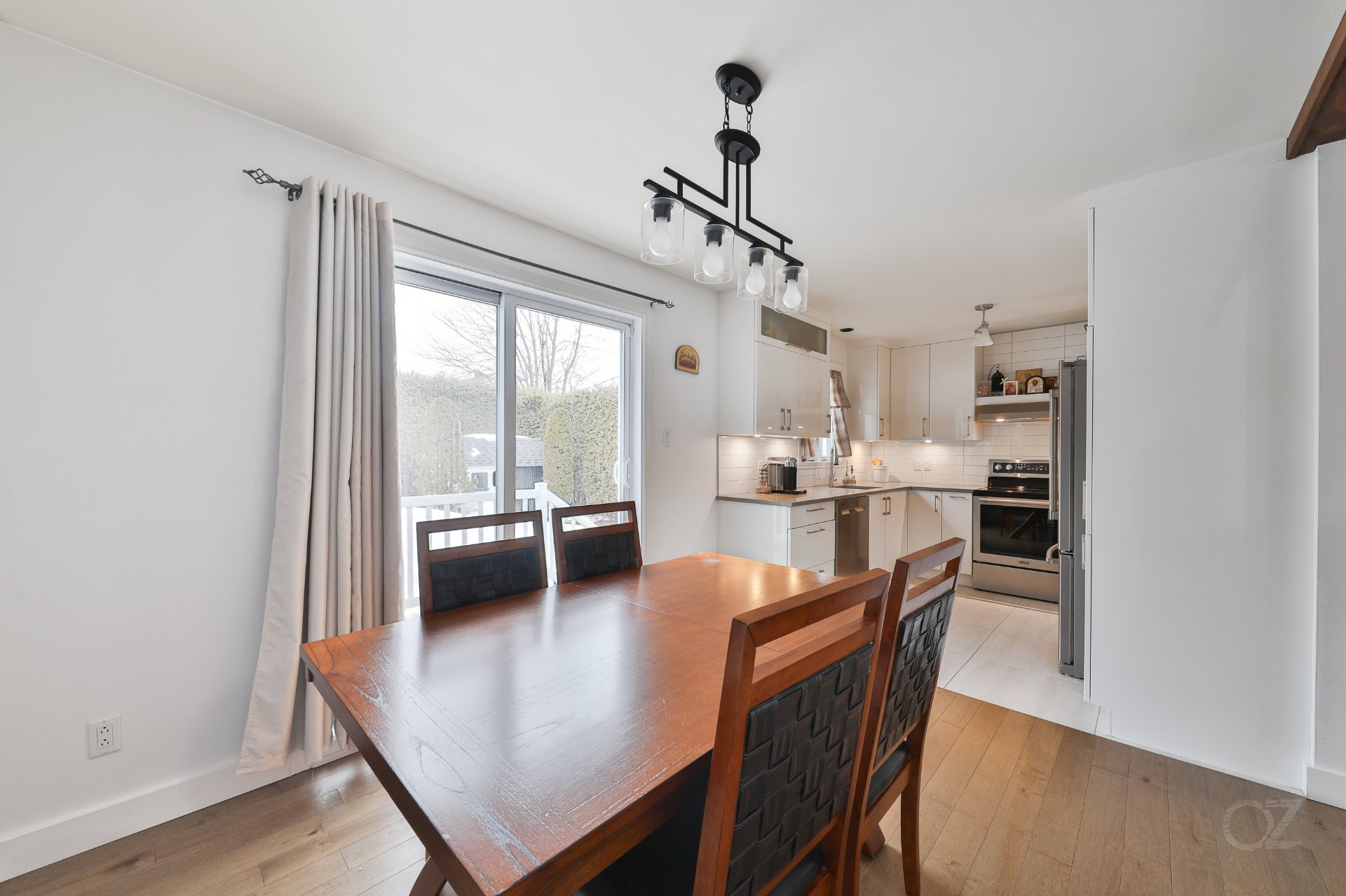 La salle à manger, adjacente à la cuisine, propose un espace convivial idéal pour recevoir. La cuisine offre un aménagement fonctionnel avec armoires contemporaines, dosseret et espace de travail pratique pour le quotidien.