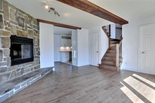 À l'intérieur, vous serez charmé par un espace de vie à aire ouverte lumineux et accueillant. Le salon, agrémenté d'un magnifique foyer en pierre et de poutres décoratives, crée une ambiance chaleureuse et distinctive. La grande fenestration inonde les pièces de lumière naturelle, mettant en valeur les planchers.